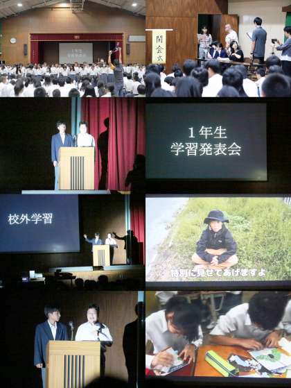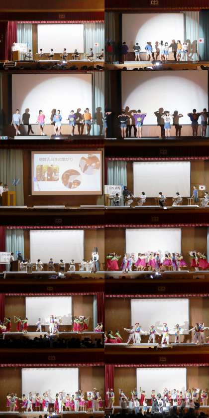 「文化委員長のあいさつ」で始まり、1年生学習発表会「努力・協力・想像力」、2年生学年発表「Let's get together〜ダンスがつなぐ日本と朝鮮半島〜」