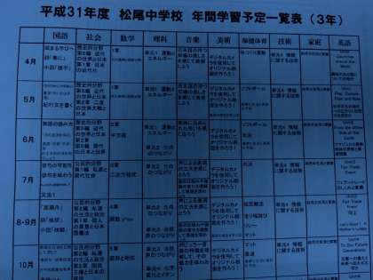 家庭訪問では「松尾中学校 年間学習予定一覧表」、「学習指導・評価計画表」の説明をさせていただきます。「年間学習予定一覧表」では各教科で学ぶ【単元・内容】の1年間の流れ、「学習指導・評価計画表」では【詳しい学習内容、その内容を通して身につけてほしい力(目標・めあて)とその到達度の測定場面・方法について】など、学習面・生活面でとても大切なお話ですので、ご家庭でもご協力よろしくお願いいたします。