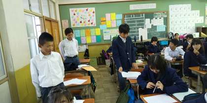 1年生国語の時間。竹取物語の冒頭の暗誦を個人で,小グループでやっています。