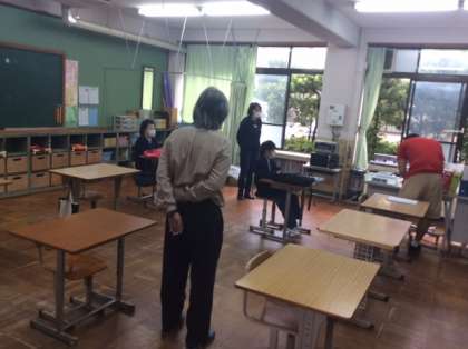 配布マスクを受け取ったり、取り組んだ家庭学習課題を提出したりしています。