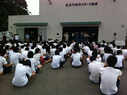 長与港につきました。いよいよペーロンの開始です。指導員の方々の話をよく聞いて,