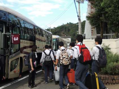 秋晴れの下,3年生は長崎の壱岐に向けて出発しました。大きな荷物を抱えながらも,笑顔があふれていました。