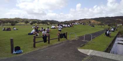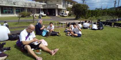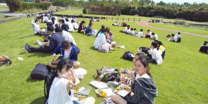 今日のお昼は,筒城浜の近くにある芝生のグランドで,お弁当をいただきました。この旅行で、全員が一堂に会して食事をとる唯一の機会です。みんなで食べるので,楽しそうです。笑顔いっぱいです。