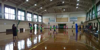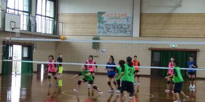 写真は、女子バレーボール部の活動風景です。(対梅津中学校)