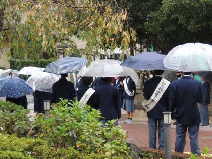 11月10日の生徒会本部役員選挙に向けて,本日より選挙運動が始まりました。初日の今日は雨が降り始めましたが,各立候補者と応援弁士が一緒になって一票を投じてもらうよう,声をあげていました。選挙運動は9日まで行われます。昼休みや終学活を使い,各候補者が演説に回ります。しっかりと公約を聞いてください。