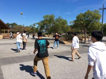 昼食後は広い芝生上で思い思いに過ごしたり,バレーボールを楽しんだりしました。このあと,金比羅さんにむけてバスは出発しています。