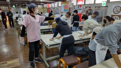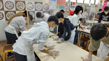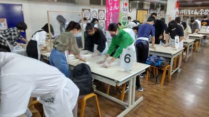 みんながんばってます。足腰をドンと構え、全力で麺を打っています。中には悪戦苦闘の人も…。