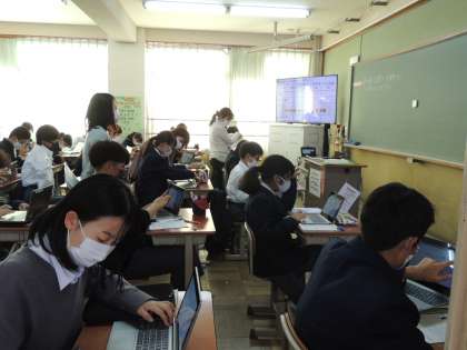 2年生は理科で「普段使用している身近な電気製品の消費電力や電力量,電気料金を計算し,考えることができる。」を目標に,端末で電力量などの計算をし,身近な電気製品について消費電力が表示されていることについて考えていました。