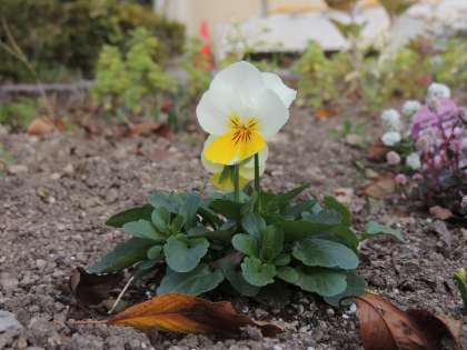 園芸ボランティアの井上さんが花壇に植物を植えてくださっています。まだ,花を咲かせているものは少ない状態ですが,やがて色とりどりの花を咲かせていくことでしょう。
