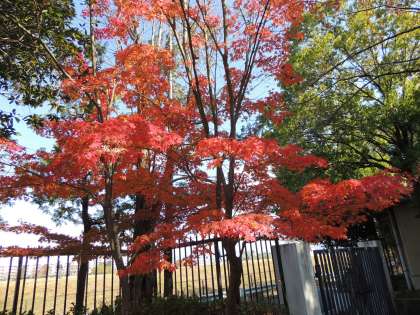 樹木が多い松尾中学校にあって意外と紅葉は少ないですが,体育館の北側にある1本が色鮮やかな紅に染まっています。