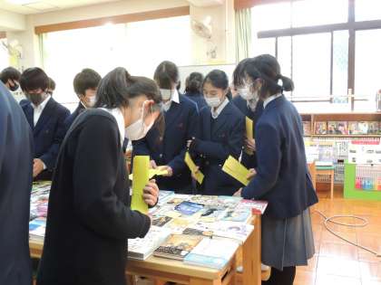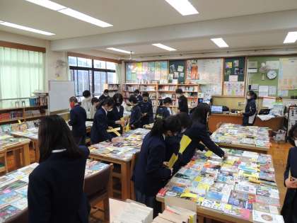 本日,選書会が行われました。図書室の机一杯に並べられた多くの本を文化委員と選書会メンバーが次々と手に取り,選んでいきます。楽しそうに本について話している姿が印象的でした。