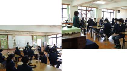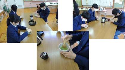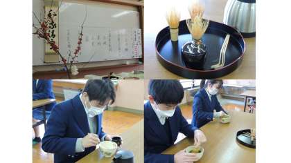 本日,3年生の家庭科で茶道体験が行われています。生花や掛け軸が飾られる部屋でお菓子のいただき方,お茶の道具や点て方等を真剣に,でも楽しそうに取り組んでいました。ほとんどの人が初めての体験だったでしょうが,昨年の華道体験と共に「和の心」を学ぶとてもよい機会です。
