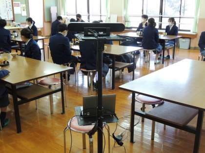 先日,PTAでプロジェクター台を購入させていただきました。毎日行っている,オンライン授業を配信する際にとても役立っています。カメラ・スピーカー等の機器をこれまでは教卓に設置していましたが,設置場所の移動が可能で,高さ調節ができるので,黒板だけを写すだけでなく,教室全体を写すときなどにも大変便利です。ありがとうございました。