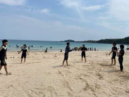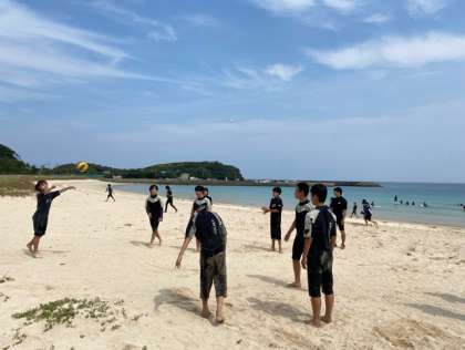 強い日差しが照りつける中,ビーチバレーを楽しんでいます。