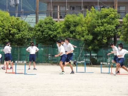保健体育の授業で,ハードル走に取り組んでいる様子です。「良かったよ」と声をかけてもらったり,アドバイスをもらったりして懸命に取り組んでいました。今日は,風も涼しく気持ちよさそうでした。