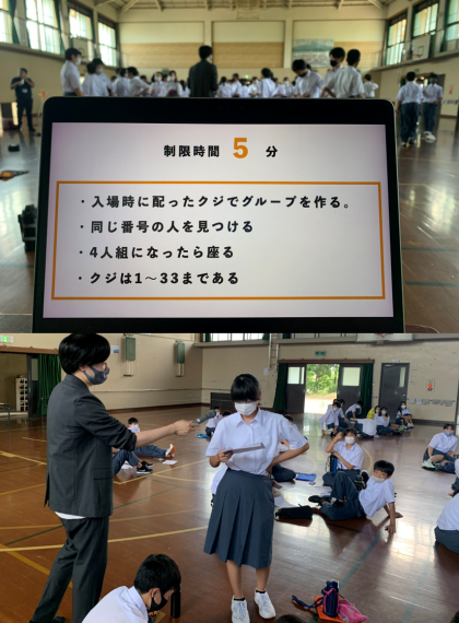 学年の親睦もかねて、ランダムな数字で4人組を作り、自己紹介ゲームを行いました。