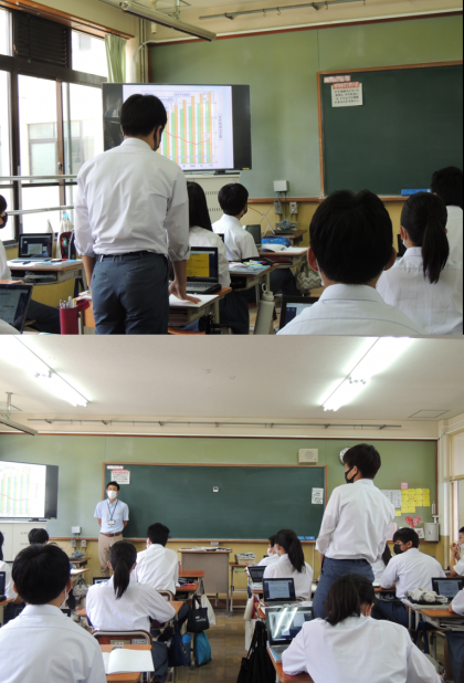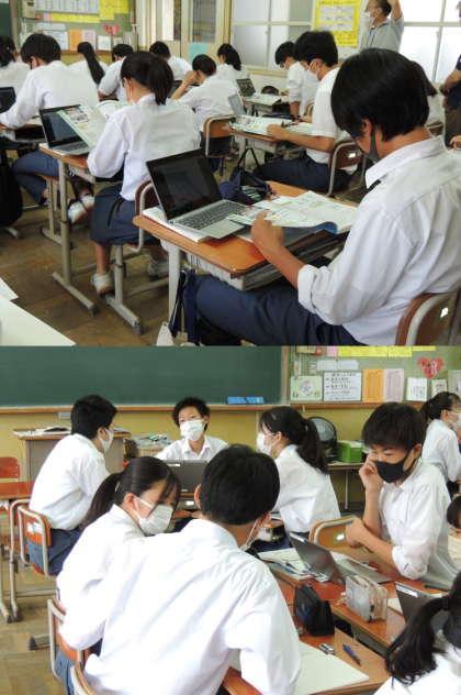 3年生は、社会で「少子高齢化の原因と課題」について取り組んでいました。資料やインターネット・教科書を用い、まずは自分で考え、それをグループで交流し、発表やロイロノートで共有していました。最終的には自分の言葉で、しっかりと用紙にまとめます。現代社会に問われている内容が、社会の担い手となる自分たちに身近に迫っていることを感じる時間でもあったと思います。