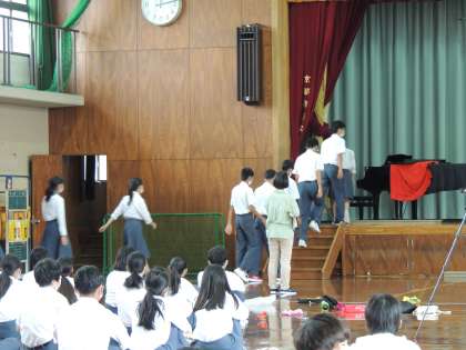 2年生にとっても、初めての合唱コンクールのリハーサルでした。一度、動きを全クラス確認した後、再度入退場をし、少し歌声の披露がありました。他のクラスのを聴いて、さらに頑張ろうという気持ちになったと思います。当日が楽しみです。