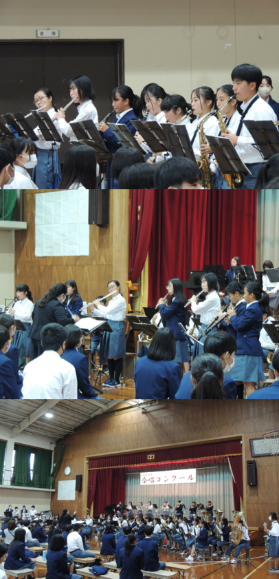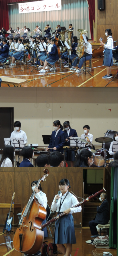 合唱コンクールの後、吹奏楽部が全校生徒にむけての演奏でした。3年生にとっては、全校生徒の前で演奏する最後です。軽快に8曲を披露してくれました。1・2年生は、Zoomを通してでしたが、十分に楽しめたと思います。最後に、生徒会本部からは、動画や寸劇を交え、体育祭・合唱コンクールの取組みを振り返り、一人ずつからメッセージがありました。