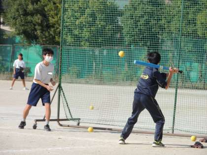 2年生は、今ソフトボールに取り組んでいます。グラウンド周辺の木々も紅葉が進み、快晴で穏やかな昼下がり。「力強い打球を飛ばすこと」を目標に、気持ちよくボールに向かっている姿が見られました。