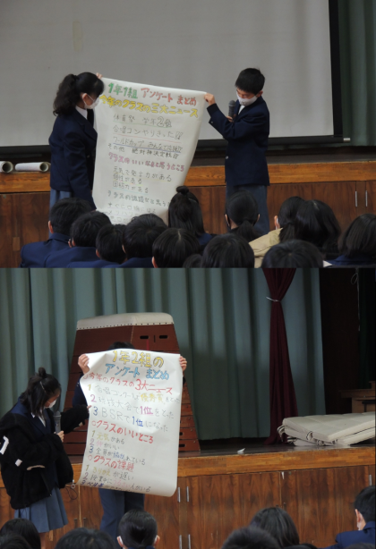 3年生は、各クラスの良かったところと改善点について、「クリスマスソングの替え歌」や「ワールドカップ」そして「オープンスクール」等になぞらえてオリジナリティあふれる発表をしていました。
