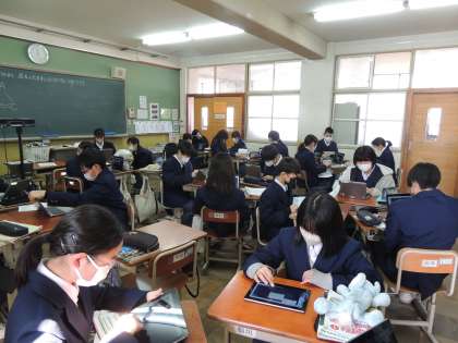 1年生の英語です。冬休みの思い出を質問し、聞き取ることに取り組んでいました。録画や入力など端末の扱いは手慣れたものです。また、聞き取ったことをまとめ、パフォーマンステストにむけての改善点などを黙々と端末にうちこんでいました。もらったコメントを参考にパフォーマンステストも頑張ってほしいと思います。