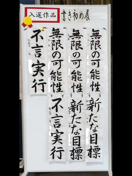 第91回京都市中学校書き初め展が行われました。松尾中学校から出品した7名の作品は、京都市の総合教育センターに展示され、1名が金賞を受賞しています。それら力作を玄関前に掲示しております。来校の際は、ぜひご覧ください。