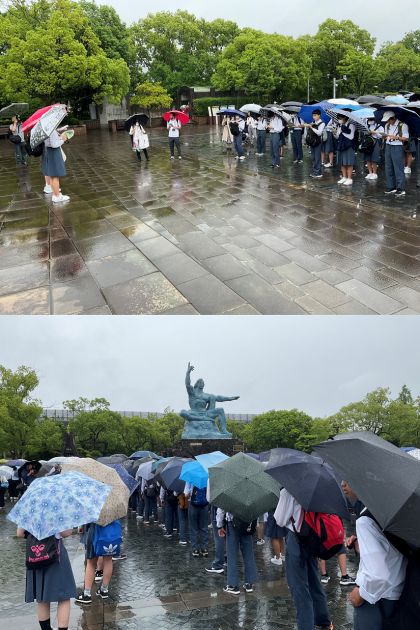 平和公園に到着し、セレモニーを行いました。「事前学習で戦争によりたくさんの命、自由、笑顔などのあたりまえの日常を失うことを学びました。戦争の残酷さやむなしさ、平和であることのありがたみを次の世代へ必ずつなぎ戦争が起こらないように笑顔が溢れる世界を実現します。」と平和の誓いを述べ、黙祷しました。その後、全員で思いを込めた、千羽鶴を奉納しています。