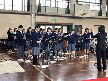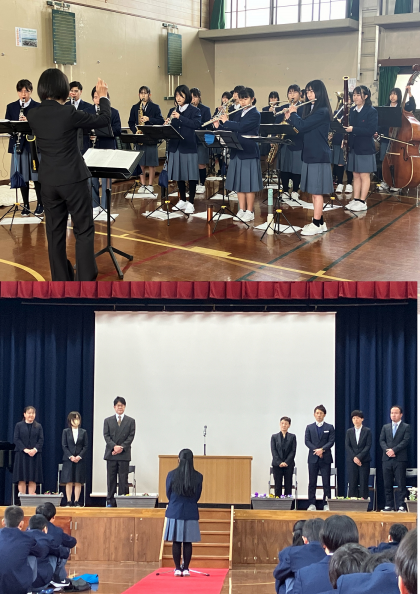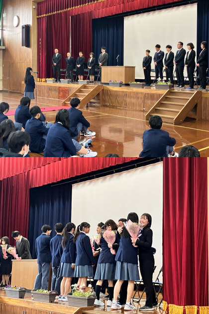 本日、本校体育館にて令和5年度の離任式を行いました。お世話になった教職員の方々から、それぞれ松尾中生、保護者、地域の方にむけて挨拶していただきました。それぞれの言葉を心に刻み、生徒・教職員一同、懸命に松尾中学校の発展に努めてまいります。退職、異動される教職員の皆様のご尽力に感謝いたします。ありがとうございました。皆様のご多幸をお祈りしております。