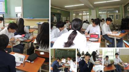 一人で、ペアで、そしてグループで等、さまざまな形で取り組む様子です。知識を身に着けるだけだなく、それをいかに活用し、そこから湧き出た疑問にどう取り組むかを考える姿、理解したことをわかりやすく伝えるにはどのような表現を用いればよいかを考える姿、そしてこれまで身に着けた力といろいろな学習用具を使いながら本当に理解ができているかを試している姿が見られました。