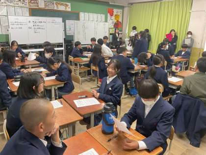 6時間目の道徳の授業で、研究授業が行われました。西京区の中学校の先生が集まり、2年生の教室で授業の様子を参観した後、授業の振り返りをしています。みなさんの良さが先生方に伝わる授業でした。