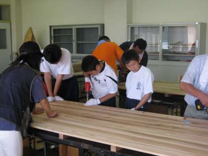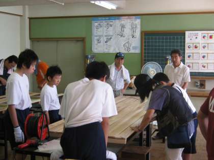 おやじの会5人・生徒5人・先生7人の総勢17人で、4m×1mのスノコ4枚、3m×1mのスノコ8枚を制作しました。