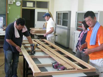 日頃電動ドライバーなど使ったことがない人もいて、最初はなかなか悪戦苦闘でしたが、おやじの会の方に「コツ」を伝授していただき、2枚目あたりからは要領を得て、結構スムーズにつくることができました。