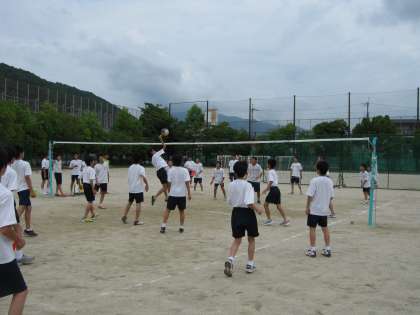 先週に比べると少し暑さはおさまった反面,途中雨もポツリポツリ。天候が心配されましたがなんとか無事に行うことができました。種目は男女ともバレーボールです。各コートでは,応援も含め大きな声が響く熱戦が繰り広げられました。まさにチーム,学級,学年が一つになったいいバレーボール大会でした。球技大会の計画から当日の朝の準備まで,がんばってくれた体育委員のみなさんありがとうございました。まずは男子の様子です。
