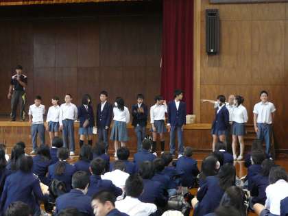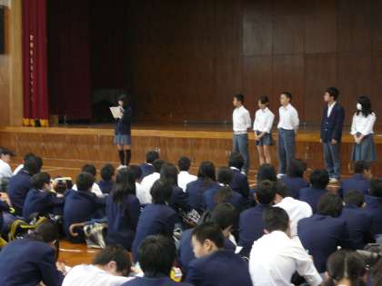 実行委員長からの話とスローガンの発表、そして最終的な注意事項が先生の方からありました。実行委員長の話の最後に、「修学旅行に行けるのは家族のおかげだから、家族に感謝の気持ちを持って出かけましょう」という言葉がありました。大事なことですね。