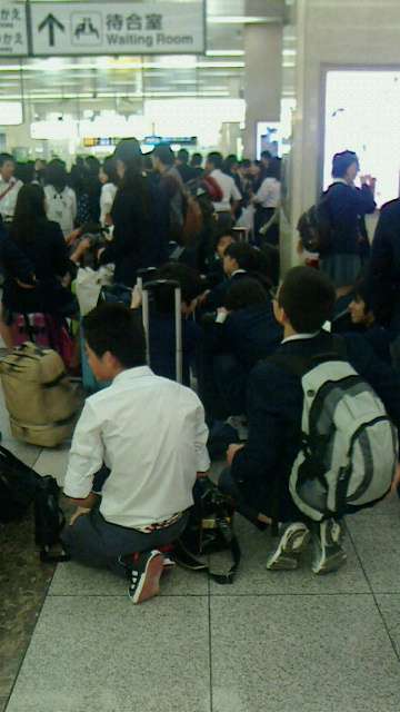 学校からバス4台に分乗して京都駅に到着。2Fコンコースで新幹線乗車隊形でホームに移動するのを待っています。9:56発ひかり462号です。乗車までしばらく時間がありますがみんな座って待ってますね!マナーはO.K.ですよ。この調子でね。