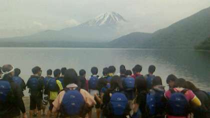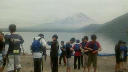 富士周辺の天候は晴れです。富士山の写真も次々と送られてきます。本栖湖でのカヌー体験が始まりました。ライフジャケットをつけてオリエンテーションです。