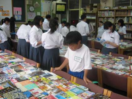 本日放課後,図書室で選書会を行いました。学年で時間帯を分けて,クラスで希望者を募り,図書委員と共に参加しました。生徒たちは興味のある本に挟むしおりを手に積極的に選んでいました。題名を見るとどの本もおもしろそうですね,迷ってしまいますね。時間が足りないくらいでした。書店の方は,新刊本の中から中学生の興味・関心を引きそうな本から様々なジャンルを織り交ぜ,二千冊あまりに絞って持ってきていただいていたようです。サッカー関係の本ですが,15枚くらいしおりの挟んである人気本もありましたね。今,世間はサッカーのワールドカップの話題で湧いています。もちろん図書室にも旬のサッカーコーナーを設置してもらっています。本はみなさんを新しい世界へ誘ってくれます。おもしろくてためになる本がたくさん増えるといいですね。7月の初旬には1年生対象にブックトークがあります。楽しみにしていてください。