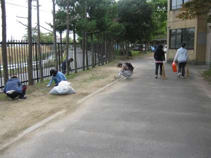 体育館北側からずっと北門に向かってのフェンス沿いや花壇、校舎・グラウンド周辺の外回り,中庭など、広範囲にわたり作業をしていただきました。本当にありがとうございました。