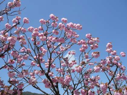 グラウンドに出てみると、校門の枝垂れ桜はかなり葉桜になってきましたが、グラウンド横の山桜は、今まさに満開です! 八重の濃いピンク色で、枝先にまとまって咲く姿が、枝垂れ桜とはまた違う風情と、春の息吹を感じます。