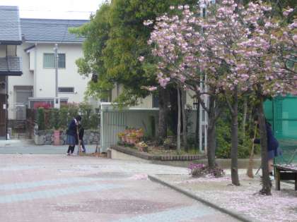 今朝も落ち葉と桜の花びらの掃き掃除を、吹奏楽部員さんが朝から頑張ってくれています。感謝! 感謝!