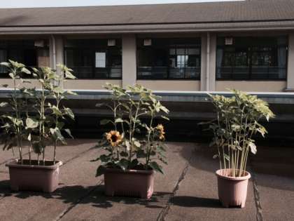 2年生の廊下の北側にある屋上では、プランターに「向日葵」を栽培しています。この前見た時はまだ花が咲いていなかったのですが、先日見ると大きな花が咲いていました。
