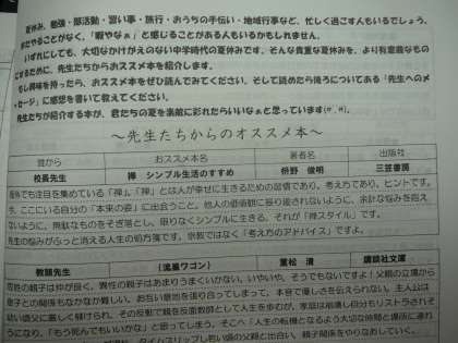 今年の「夏休みのしおり」には、松尾中の先生たちからの「お薦め本」コーナーを設けました。いろんなジャンルのいろんな本が紹介されています。紹介文を読んで興味が湧けば、ぜひ一度チャレンジしてみて下さい。