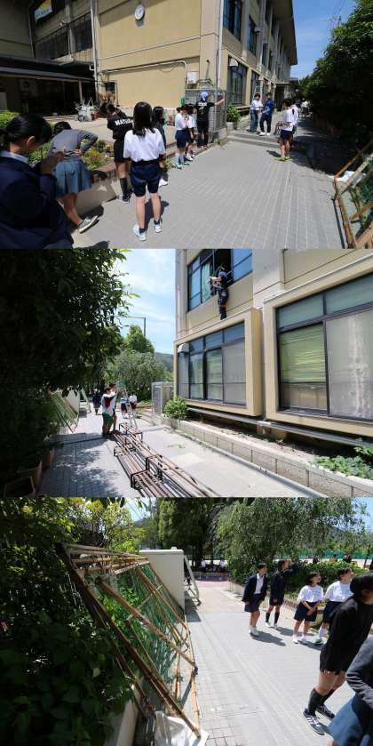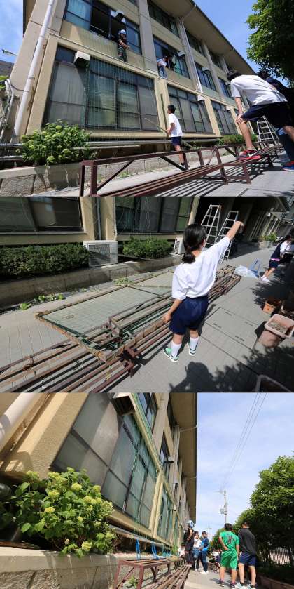 校舎の南側に、二階からネットを張り、下にプランタを並べました。