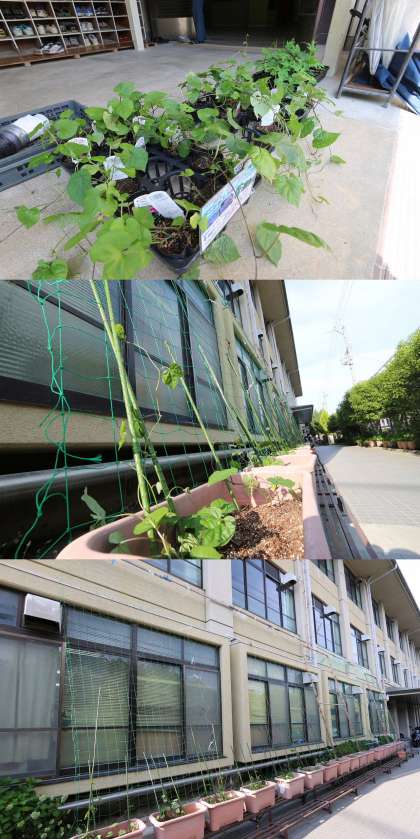 午後、環境美化委員会の人が、時間と精魂を込めて「みどりのカーテン」の準備をしました。