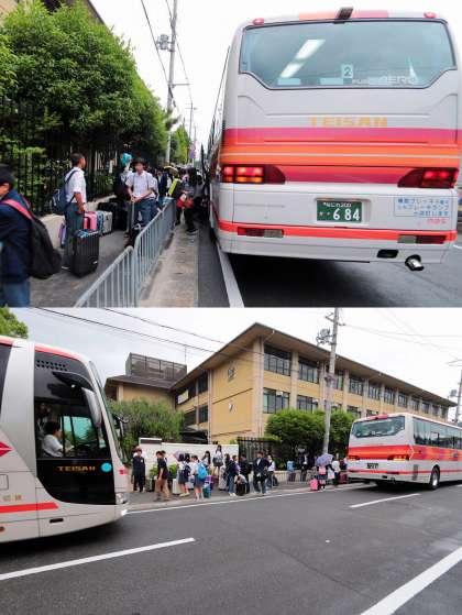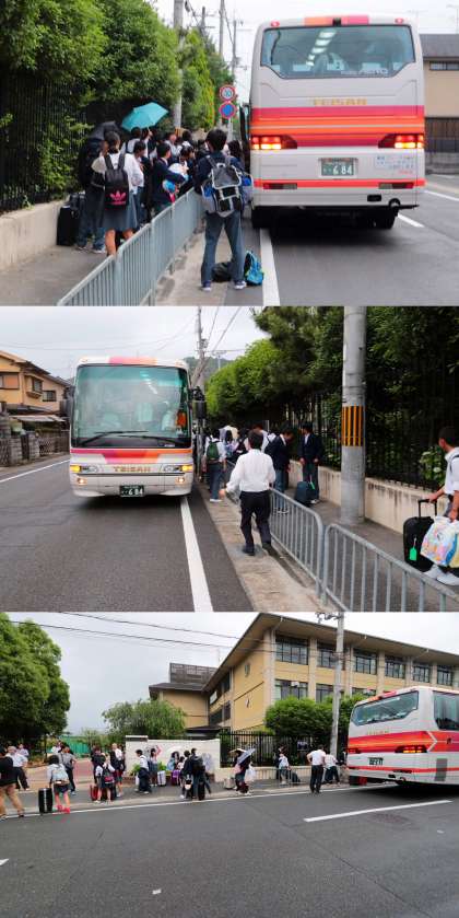 松尾中学校修学旅行一行は、予定通り午後6時に松尾中学校に帰ってきました。