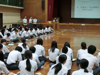 本日3限、3年生は体育館で学年道徳を行いました。テーマは「なでしこの教え」〜あきらめない心をつくる50の教え〜というもので、なでしこジャパンの選手たちの言葉から生き方を学ぶというものです。50の教えから一つ自分の共感できること、印象的だったものを選び、その理由を自分のことばで表現し発表するというものです。
