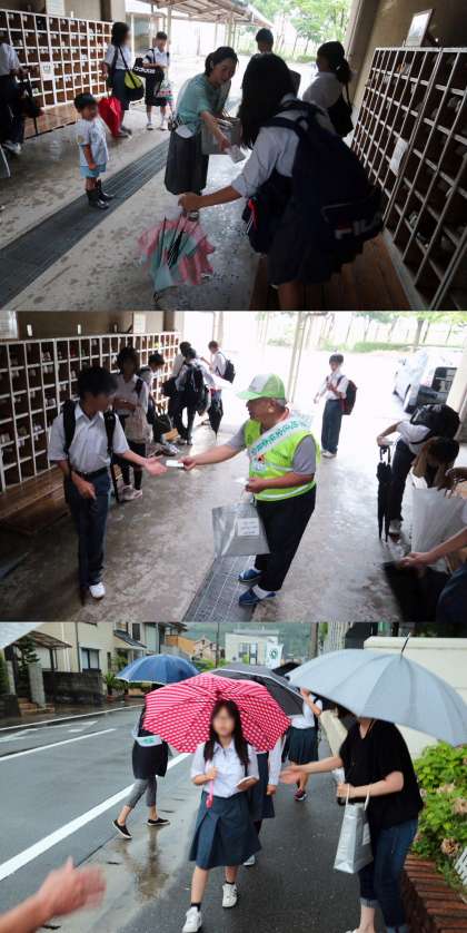 校門付近で行われる予定でしたが、配布開始予定時刻の午前8時頃に滝のような雨が降り出したので、配布場所が昇降口付近に急遽変更になりました。