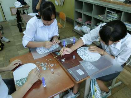 3年生の展示作成の様子です。団扇を使った貼り絵ですね。みんなで合わせてどんなものになるのかな?楽しみです。でも、気の遠くなるような細かい作業ですね。根気よく取り組んでいます。
