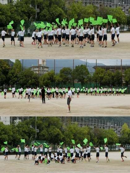 写真は体育祭のトリをかざる「3年生集団演技」の練習風景です。体育祭まであと2日、最終調整にはいっています。悔いの残らないよう全力で取り組んで、本番すばらしい演技を期待しています。
